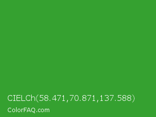 CIELCh 58.471,70.871,137.588 Color is a normal green color and the nearest color is Wageningen Green #34b233. Hex code #35a130 and RGB value is rgb(53,161,48). In RGB color space, this color is composed of 21% red, 63% green, 19% blue, In CMYK color space, this color is composed of 67% cyan, 0% magenta, 70% yellow , 37% black , In HSL color space, this color has a hue angle of 117° , 54% saturation and 41% lightness.