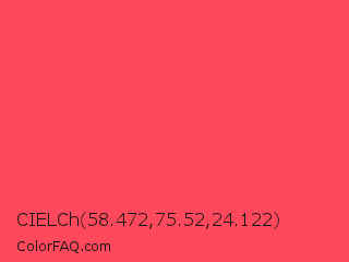 CIELCh 58.472,75.52,24.122 Color is a light red color and the nearest color is Neon Fuchsia #fe4164. Hex code #fe485b and RGB value is rgb(254,72,91). In RGB color space, this color is composed of 100% red, 28% green, 36% blue, In CMYK color space, this color is composed of 0% cyan, 72% magenta, 64% yellow , 0% black , In HSL color space, this color has a hue angle of 354° , 99% saturation and 64% lightness.