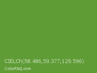 CIELCh 58.486,59.377,129.596 Color is a normal green color and the nearest color is Maximum Green #5e8c31. Hex code #5f9c36 and RGB value is rgb(95,156,54). In RGB color space, this color is composed of 37% red, 61% green, 21% blue, In CMYK color space, this color is composed of 39% cyan, 0% magenta, 65% yellow , 39% black , In HSL color space, this color has a hue angle of 96° , 49% saturation and 41% lightness.