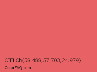 CIELCh 58.488,57.703,24.979 Color is a light red color and the nearest color is Sunglo #e16865. Hex code #e76165 and RGB value is rgb(231,97,101). In RGB color space, this color is composed of 91% red, 38% green, 40% blue, In CMYK color space, this color is composed of 0% cyan, 58% magenta, 56% yellow , 9% black , In HSL color space, this color has a hue angle of 358° , 74% saturation and 64% lightness.