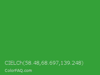CIELCh 58.48,68.697,139.248 Color is a normal green color and the nearest color is Wageningen Green #34b233. Hex code #33a137 and RGB value is rgb(51,161,55). In RGB color space, this color is composed of 20% red, 63% green, 22% blue, In CMYK color space, this color is composed of 68% cyan, 0% magenta, 66% yellow , 37% black , In HSL color space, this color has a hue angle of 122° , 52% saturation and 42% lightness.