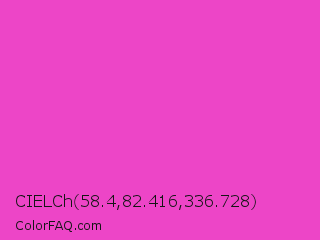 CIELCh 58.4,82.416,336.728 Color is a normal magenta color and the nearest color is Razzle Dazzle Rose #ff33cc. Hex code #ed45c7 and RGB value is rgb(237,69,199). In RGB color space, this color is composed of 93% red, 27% green, 78% blue, In CMYK color space, this color is composed of 0% cyan, 71% magenta, 16% yellow , 7% black , In HSL color space, this color has a hue angle of 314° , 82% saturation and 60% lightness.
