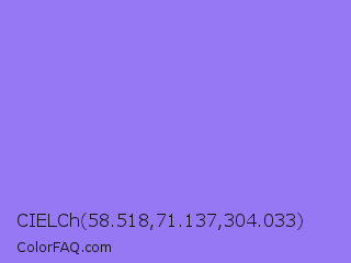CIELCh 58.518,71.137,304.033 Color is a light indigo color and the nearest color is Medium Purple #9370db. Hex code #9678f5 and RGB value is rgb(150,120,245). In RGB color space, this color is composed of 59% red, 47% green, 96% blue, In CMYK color space, this color is composed of 39% cyan, 51% magenta, 0% yellow , 4% black , In HSL color space, this color has a hue angle of 254° , 86% saturation and 72% lightness.