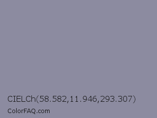 CIELCh 58.582,11.946,293.307 Color is a normal indigo color and the nearest color is Manatee Crayola #8d90a1. Hex code #8c8ba0 and RGB value is rgb(140,139,160). In RGB color space, this color is composed of 55% red, 55% green, 63% blue, In CMYK color space, this color is composed of 13% cyan, 13% magenta, 0% yellow , 37% black , In HSL color space, this color has a hue angle of 243° , 10% saturation and 59% lightness.