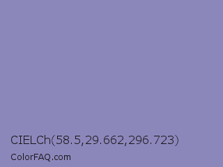 CIELCh 58.5,29.662,296.723 Color is a light indigo color and the nearest color is Lavender Purple #967bb6. Hex code #8c87bb and RGB value is rgb(140,135,187). In RGB color space, this color is composed of 55% red, 53% green, 73% blue, In CMYK color space, this color is composed of 25% cyan, 28% magenta, 0% yellow , 27% black , In HSL color space, this color has a hue angle of 246° , 28% saturation and 63% lightness.
