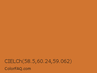 CIELCh 58.5,60.24,59.062 Color is a normal orange color and the nearest color is Bronze #cd7f32. Hex code #d17530 and RGB value is rgb(209,117,48). In RGB color space, this color is composed of 82% red, 46% green, 19% blue, In CMYK color space, this color is composed of 0% cyan, 44% magenta, 77% yellow , 18% black , In HSL color space, this color has a hue angle of 26° , 64% saturation and 50% lightness.