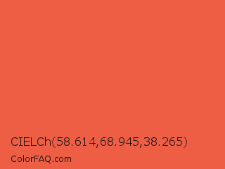 CIELCh 58.614,68.945,38.265 Color is a normal red color and the nearest color is Orange Soda #fa5b3d. Hex code #ee5e45 and RGB value is rgb(238,94,69). In RGB color space, this color is composed of 93% red, 37% green, 27% blue, In CMYK color space, this color is composed of 0% cyan, 61% magenta, 71% yellow , 7% black , In HSL color space, this color has a hue angle of 9° , 83% saturation and 60% lightness.
