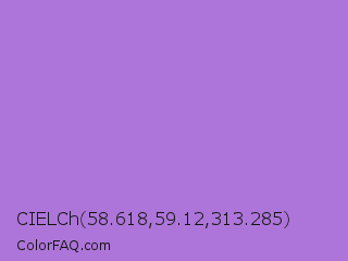CIELCh 58.618,59.12,313.285 Color is a light purple color and the nearest color is Lavender #b57edc. Hex code #ad75d9 and RGB value is rgb(173,117,217). In RGB color space, this color is composed of 68% red, 46% green, 85% blue, In CMYK color space, this color is composed of 20% cyan, 46% magenta, 0% yellow , 15% black , In HSL color space, this color has a hue angle of 274° , 57% saturation and 65% lightness.