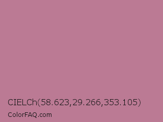 CIELCh 58.623,29.266,353.105 Color is a light rose color and the nearest color is English Lavender #b48395. Hex code #bb7a94 and RGB value is rgb(187,122,148). In RGB color space, this color is composed of 73% red, 48% green, 58% blue, In CMYK color space, this color is composed of 0% cyan, 35% magenta, 21% yellow , 27% black , In HSL color space, this color has a hue angle of 336° , 32% saturation and 61% lightness.