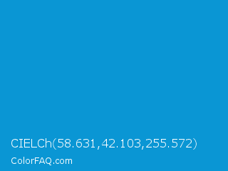 CIELCh 58.631,42.103,255.572 Color is a normal blue color and the nearest color is Rich Electric Blue #0892d0. Hex code #0a96d4 and RGB value is rgb(10,150,212). In RGB color space, this color is composed of 4% red, 59% green, 83% blue, In CMYK color space, this color is composed of 95% cyan, 29% magenta, 0% yellow , 17% black , In HSL color space, this color has a hue angle of 198° , 91% saturation and 44% lightness.