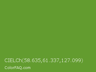 CIELCh 58.635,61.337,127.099 Color is a normal green color and the nearest color is Maximum Green #5e8c31. Hex code #639c2f and RGB value is rgb(99,156,47). In RGB color space, this color is composed of 39% red, 61% green, 18% blue, In CMYK color space, this color is composed of 37% cyan, 0% magenta, 70% yellow , 39% black , In HSL color space, this color has a hue angle of 91° , 54% saturation and 40% lightness.