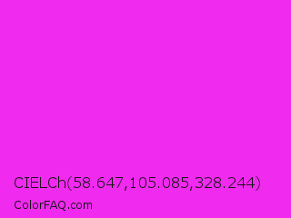 CIELCh 58.647,105.085,328.244 Color is a normal magenta color and the nearest color is Hot Magenta #ff1dce. Hex code #f12af0 and RGB value is rgb(241,42,240). In RGB color space, this color is composed of 95% red, 16% green, 94% blue, In CMYK color space, this color is composed of 0% cyan, 83% magenta, 0% yellow , 5% black , In HSL color space, this color has a hue angle of 300° , 88% saturation and 55% lightness.