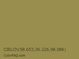 CIELCh 58.653,36.226,98.086 Color is a normal yellow color and the nearest color is Dark Tan #918151. Hex code #998e4d and RGB value is rgb(153,142,77). In RGB color space, this color is composed of 60% red, 56% green, 30% blue, In CMYK color space, this color is composed of 0% cyan, 7% magenta, 50% yellow , 40% black , In HSL color space, this color has a hue angle of 51° , 33% saturation and 45% lightness.