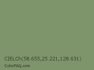 CIELCh 58.655,25.221,128.631 Color is a normal green color and the nearest color is Battleship Gray #828f72. Hex code #7e946a and RGB value is rgb(126,148,106). In RGB color space, this color is composed of 49% red, 58% green, 42% blue, In CMYK color space, this color is composed of 15% cyan, 0% magenta, 28% yellow , 42% black , In HSL color space, this color has a hue angle of 91° , 17% saturation and 50% lightness.