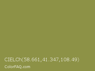 CIELCh 58.661,41.347,108.49 Color is a normal yellow color and the nearest color is Sycamore #908d39. Hex code #8d9246 and RGB value is rgb(141,146,70). In RGB color space, this color is composed of 55% red, 57% green, 27% blue, In CMYK color space, this color is composed of 3% cyan, 0% magenta, 52% yellow , 43% black , In HSL color space, this color has a hue angle of 64° , 35% saturation and 42% lightness.