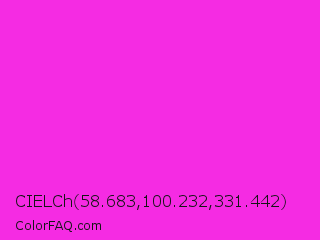 CIELCh 58.683,100.232,331.442 Color is a normal magenta color and the nearest color is Razzle Dazzle Rose #ff33cc. Hex code #f52be3 and RGB value is rgb(245,43,227). In RGB color space, this color is composed of 96% red, 17% green, 89% blue, In CMYK color space, this color is composed of 0% cyan, 82% magenta, 7% yellow , 4% black , In HSL color space, this color has a hue angle of 305° , 91% saturation and 56% lightness.