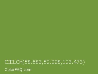 CIELCh 58.683,52.228,123.473 Color is a normal green color and the nearest color is Palm Leaf #6f9940. Hex code #72993c and RGB value is rgb(114,153,60). In RGB color space, this color is composed of 45% red, 60% green, 24% blue, In CMYK color space, this color is composed of 25% cyan, 0% magenta, 61% yellow , 40% black , In HSL color space, this color has a hue angle of 85° , 44% saturation and 42% lightness.