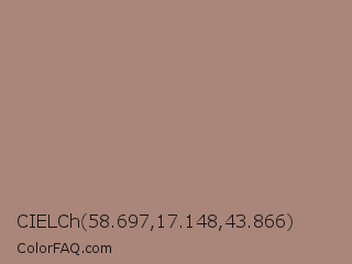 CIELCh 58.697,17.148,43.866 Color is a normal color and the nearest color is Pharlap #a3807b. Hex code #aa8579 and RGB value is rgb(170,133,121). In RGB color space, this color is composed of 67% red, 52% green, 47% blue, In CMYK color space, this color is composed of 0% cyan, 22% magenta, 29% yellow , 33% black , In HSL color space, this color has a hue angle of 15° , 22% saturation and 57% lightness.