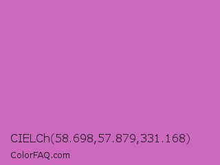 CIELCh 58.698,57.879,331.168 Color is a light magenta color and the nearest color is Sky Magenta #cf71af. Hex code #cc69bf and RGB value is rgb(204,105,191). In RGB color space, this color is composed of 80% red, 41% green, 75% blue, In CMYK color space, this color is composed of 0% cyan, 49% magenta, 6% yellow , 20% black , In HSL color space, this color has a hue angle of 308° , 49% saturation and 61% lightness.