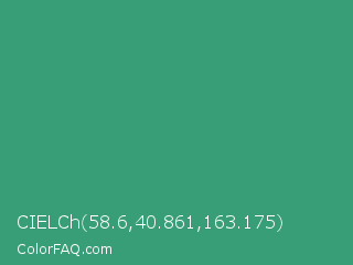 CIELCh 58.6,40.861,163.175 Color is a normal green color and the nearest color is Illuminating Emerald #319177. Hex code #379e77 and RGB value is rgb(55,158,119). In RGB color space, this color is composed of 22% red, 62% green, 47% blue, In CMYK color space, this color is composed of 65% cyan, 0% magenta, 25% yellow , 38% black , In HSL color space, this color has a hue angle of 157° , 48% saturation and 42% lightness.