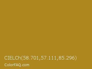CIELCh 58.701,57.111,85.296 Color is a normal orange color and the nearest color is University Of California Gold #b78727. Hex code #ae881f and RGB value is rgb(174,136,31). In RGB color space, this color is composed of 68% red, 53% green, 12% blue, In CMYK color space, this color is composed of 0% cyan, 22% magenta, 82% yellow , 32% black , In HSL color space, this color has a hue angle of 44° , 70% saturation and 40% lightness.