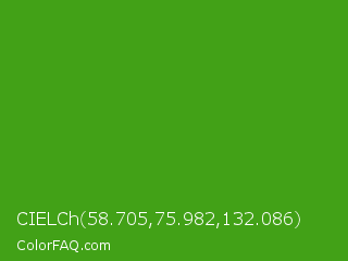 CIELCh 58.705,75.982,132.086 Color is a normal green color and the nearest color is Vida Loca #549019. Hex code #42a117 and RGB value is rgb(66,161,23). In RGB color space, this color is composed of 26% red, 63% green, 9% blue, In CMYK color space, this color is composed of 59% cyan, 0% magenta, 86% yellow , 37% black , In HSL color space, this color has a hue angle of 101° , 75% saturation and 36% lightness.