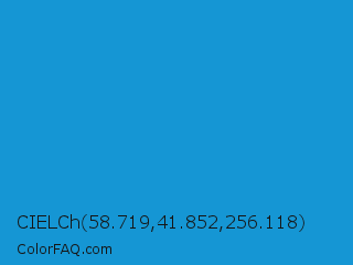 CIELCh 58.719,41.852,256.118 Color is a normal blue color and the nearest color is Rich Electric Blue #0892d0. Hex code #1596d4 and RGB value is rgb(21,150,212). In RGB color space, this color is composed of 8% red, 59% green, 83% blue, In CMYK color space, this color is composed of 90% cyan, 29% magenta, 0% yellow , 17% black , In HSL color space, this color has a hue angle of 199° , 82% saturation and 46% lightness.