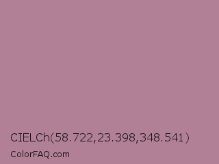 CIELCh 58.722,23.398,348.541 Color is a normal rose color and the nearest color is English Lavender #b48395. Hex code #b17f96 and RGB value is rgb(177,127,150). In RGB color space, this color is composed of 69% red, 50% green, 59% blue, In CMYK color space, this color is composed of 0% cyan, 28% magenta, 15% yellow , 31% black , In HSL color space, this color has a hue angle of 332° , 24% saturation and 60% lightness.