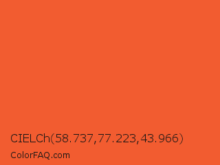 CIELCh 58.737,77.223,43.966 Color is a normal red color and the nearest color is Flamingo #f2552a. Hex code #f25c30 and RGB value is rgb(242,92,48). In RGB color space, this color is composed of 95% red, 36% green, 19% blue, In CMYK color space, this color is composed of 0% cyan, 62% magenta, 80% yellow , 5% black , In HSL color space, this color has a hue angle of 14° , 88% saturation and 57% lightness.