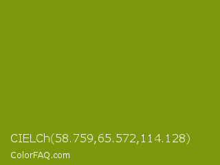 CIELCh 58.759,65.572,114.128 Color is a normal lime color and the nearest color is Limeade #6f9d02. Hex code #7c980c and RGB value is rgb(124,152,12). In RGB color space, this color is composed of 49% red, 60% green, 5% blue, In CMYK color space, this color is composed of 18% cyan, 0% magenta, 92% yellow , 40% black , In HSL color space, this color has a hue angle of 72° , 85% saturation and 32% lightness.