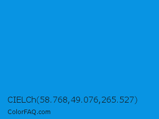 CIELCh 58.768,49.076,265.527 Color is a normal blue color and the nearest color is Rich Electric Blue #0892d0. Hex code #0894e3 and RGB value is rgb(8,148,227). In RGB color space, this color is composed of 3% red, 58% green, 89% blue, In CMYK color space, this color is composed of 96% cyan, 35% magenta, 0% yellow , 11% black , In HSL color space, this color has a hue angle of 202° , 93% saturation and 46% lightness.