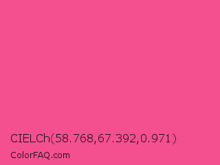 CIELCh 58.768,67.392,0.971 Color is a light rose color and the nearest color is French Rose #f64a8a. Hex code #f44f8e and RGB value is rgb(244,79,142). In RGB color space, this color is composed of 96% red, 31% green, 56% blue, In CMYK color space, this color is composed of 0% cyan, 68% magenta, 42% yellow , 4% black , In HSL color space, this color has a hue angle of 337° , 88% saturation and 63% lightness.