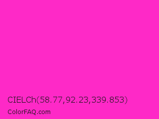 CIELCh 58.77,92.23,339.853 Color is a normal magenta color and the nearest color is Razzle Dazzle Rose #ff33cc. Hex code #fe29c7 and RGB value is rgb(254,41,199). In RGB color space, this color is composed of 100% red, 16% green, 78% blue, In CMYK color space, this color is composed of 0% cyan, 84% magenta, 22% yellow , 0% black , In HSL color space, this color has a hue angle of 315° , 99% saturation and 58% lightness.