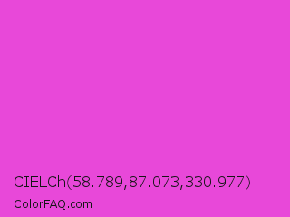 CIELCh 58.789,87.073,330.977 Color is a normal magenta color and the nearest color is Purple Pizzazz #fe4eda. Hex code #e848d9 and RGB value is rgb(232,72,217). In RGB color space, this color is composed of 91% red, 28% green, 85% blue, In CMYK color space, this color is composed of 0% cyan, 69% magenta, 6% yellow , 9% black , In HSL color space, this color has a hue angle of 306° , 78% saturation and 60% lightness.