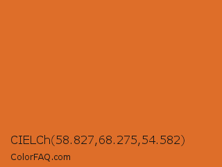 CIELCh 58.827,68.275,54.582 Color is a normal orange color and the nearest color is Deep Carrot Orange #e9692c. Hex code #de6e29 and RGB value is rgb(222,110,41). In RGB color space, this color is composed of 87% red, 43% green, 16% blue, In CMYK color space, this color is composed of 0% cyan, 50% magenta, 82% yellow , 13% black , In HSL color space, this color has a hue angle of 23° , 73% saturation and 52% lightness.