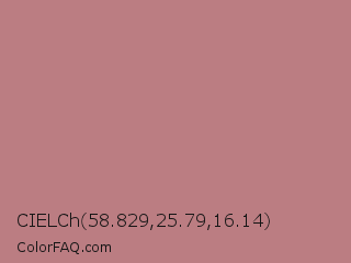 CIELCh 58.829,25.79,16.14 Color is a light red color and the nearest color is Old Rose #c08081. Hex code #bb7d82 and RGB value is rgb(187,125,130). In RGB color space, this color is composed of 73% red, 49% green, 51% blue, In CMYK color space, this color is composed of 0% cyan, 33% magenta, 30% yellow , 27% black , In HSL color space, this color has a hue angle of 355° , 31% saturation and 61% lightness.