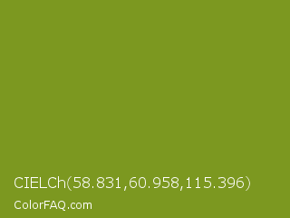 CIELCh 58.831,60.958,115.396 Color is a normal lime color and the nearest color is Wasabi #788a25. Hex code #7c9820 and RGB value is rgb(124,152,32). In RGB color space, this color is composed of 49% red, 60% green, 13% blue, In CMYK color space, this color is composed of 18% cyan, 0% magenta, 79% yellow , 40% black , In HSL color space, this color has a hue angle of 74° , 65% saturation and 36% lightness.
