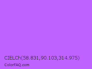 CIELCh 58.831,90.103,314.975 Color is a light purple color and the nearest color is Heliotrope #df73ff. Hex code #bf61ff and RGB value is rgb(191,97,255). In RGB color space, this color is composed of 75% red, 38% green, 100% blue, In CMYK color space, this color is composed of 25% cyan, 62% magenta, 0% yellow , 0% black , In HSL color space, this color has a hue angle of 276° , 100% saturation and 69% lightness.