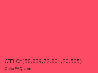 CIELCh 58.839,72.801,20.505 Color is a light red color and the nearest color is Magic Potion #ff4466. Hex code #fd4b65 and RGB value is rgb(253,75,101). In RGB color space, this color is composed of 99% red, 29% green, 40% blue, In CMYK color space, this color is composed of 0% cyan, 70% magenta, 60% yellow , 1% black , In HSL color space, this color has a hue angle of 351° , 98% saturation and 64% lightness.