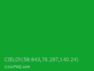 CIELCh 58.843,76.297,140.24 Color is a normal green color and the nearest color is North Texas Green #059033. Hex code #10a42e and RGB value is rgb(16,164,46). In RGB color space, this color is composed of 6% red, 64% green, 18% blue, In CMYK color space, this color is composed of 90% cyan, 0% magenta, 72% yellow , 36% black , In HSL color space, this color has a hue angle of 132° , 82% saturation and 35% lightness.
