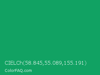 CIELCh 58.845,55.089,155.191 Color is a normal green color and the nearest color is Green Haze #01a368. Hex code #11a263 and RGB value is rgb(17,162,99). In RGB color space, this color is composed of 7% red, 64% green, 39% blue, In CMYK color space, this color is composed of 90% cyan, 0% magenta, 39% yellow , 36% black , In HSL color space, this color has a hue angle of 154° , 81% saturation and 35% lightness.