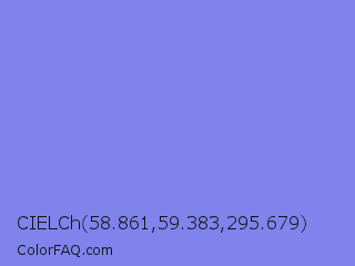 CIELCh 58.861,59.383,295.679 Color is a light blue color and the nearest color is Chetwode Blue #8581d9. Hex code #8083ec and RGB value is rgb(128,131,236). In RGB color space, this color is composed of 50% red, 51% green, 93% blue, In CMYK color space, this color is composed of 46% cyan, 44% magenta, 0% yellow , 7% black , In HSL color space, this color has a hue angle of 238° , 74% saturation and 71% lightness.