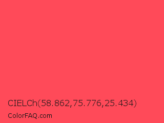 CIELCh 58.862,75.776,25.434 Color is a light red color and the nearest color is Neon Fuchsia #fe4164. Hex code #ff4a59 and RGB value is rgb(255,74,89). In RGB color space, this color is composed of 100% red, 29% green, 35% blue, In CMYK color space, this color is composed of 0% cyan, 71% magenta, 65% yellow , 0% black , In HSL color space, this color has a hue angle of 355° , 100% saturation and 65% lightness.