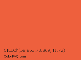 CIELCh 58.863,70.869,41.72 Color is a normal red color and the nearest color is Orange Soda #fa5b3d. Hex code #ee603d and RGB value is rgb(238,96,61). In RGB color space, this color is composed of 93% red, 38% green, 24% blue, In CMYK color space, this color is composed of 0% cyan, 60% magenta, 74% yellow , 7% black , In HSL color space, this color has a hue angle of 12° , 84% saturation and 59% lightness.