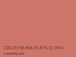 CIELCh 58.868,39.879,32.394 Color is a light red color and the nearest color is Contessa #c6726b. Hex code #ce756a and RGB value is rgb(206,117,106). In RGB color space, this color is composed of 81% red, 46% green, 42% blue, In CMYK color space, this color is composed of 0% cyan, 43% magenta, 49% yellow , 19% black , In HSL color space, this color has a hue angle of 7° , 51% saturation and 61% lightness.