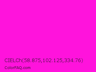 CIELCh 58.875,102.125,334.76 Color is a normal magenta color and the nearest color is Hot Magenta #ff1dce. Hex code #ff13dc and RGB value is rgb(255,19,220). In RGB color space, this color is composed of 100% red, 7% green, 86% blue, In CMYK color space, this color is composed of 0% cyan, 93% magenta, 14% yellow , 0% black , In HSL color space, this color has a hue angle of 309° , 100% saturation and 54% lightness.