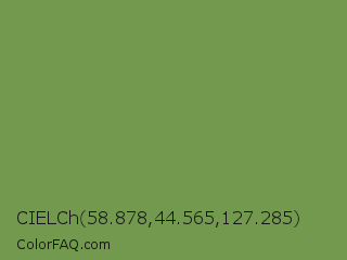 CIELCh 58.878,44.565,127.285 Color is a normal green color and the nearest color is Palm Leaf #6f9940. Hex code #72994d and RGB value is rgb(114,153,77). In RGB color space, this color is composed of 45% red, 60% green, 30% blue, In CMYK color space, this color is composed of 25% cyan, 0% magenta, 50% yellow , 40% black , In HSL color space, this color has a hue angle of 91° , 33% saturation and 45% lightness.