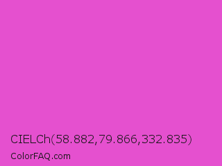 CIELCh 58.882,79.866,332.835 Color is a light magenta color and the nearest color is Purple Pizzazz #fe4eda. Hex code #e550cf and RGB value is rgb(229,80,207). In RGB color space, this color is composed of 90% red, 31% green, 81% blue, In CMYK color space, this color is composed of 0% cyan, 65% magenta, 10% yellow , 10% black , In HSL color space, this color has a hue angle of 309° , 74% saturation and 61% lightness.