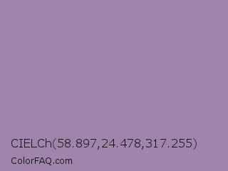 CIELCh 58.897,24.478,317.255 Color is a normal purple color and the nearest color is Lavender Purple #967bb6. Hex code #a084ab and RGB value is rgb(160,132,171). In RGB color space, this color is composed of 63% red, 52% green, 67% blue, In CMYK color space, this color is composed of 6% cyan, 23% magenta, 0% yellow , 33% black , In HSL color space, this color has a hue angle of 283° , 19% saturation and 59% lightness.