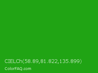 CIELCh 58.89,81.822,135.899 Color is a normal green color and the nearest color is Slimy Green #299617. Hex code #20a414 and RGB value is rgb(32,164,20). In RGB color space, this color is composed of 13% red, 64% green, 8% blue, In CMYK color space, this color is composed of 80% cyan, 0% magenta, 88% yellow , 36% black , In HSL color space, this color has a hue angle of 115° , 78% saturation and 36% lightness.